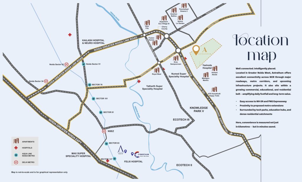 Bhutani Astrathum is situated in Noida Extension, one of the fastest-growing areas of Greater Noida West. Being next to the well-known Yashoda Hospital gives the project a major advantage. The location offers smooth connectivity to Noida, Greater Noida, and Delhi through major roads like the Noida–Greater Noida Expressway, NH-24, and the FNG Expressway.